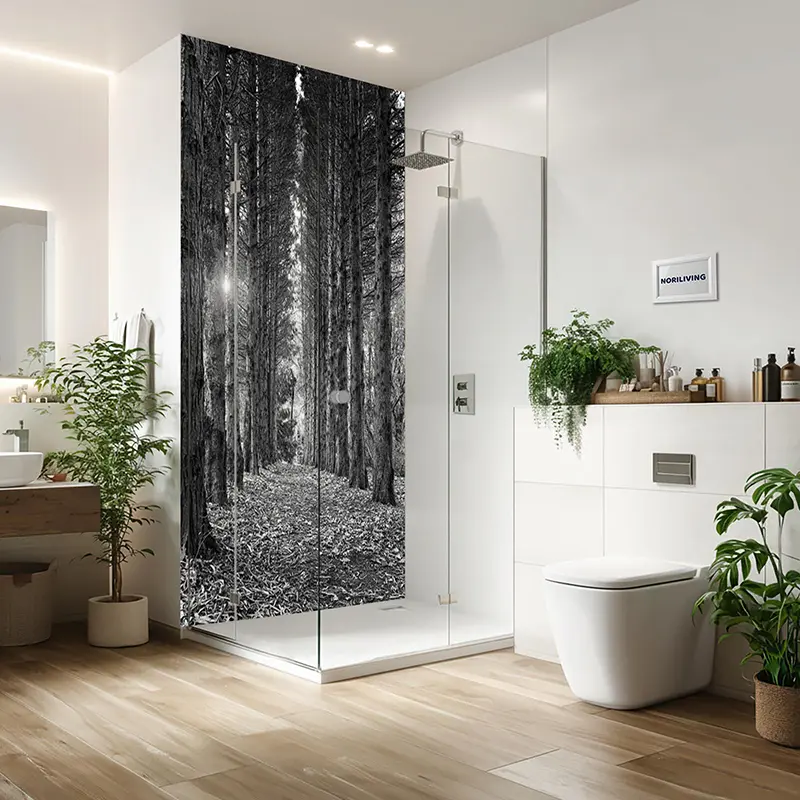 Produktinformationen "Duschrückwand Aluverbund Wald mit Sonnenschein 621 schwarz-weiß"
