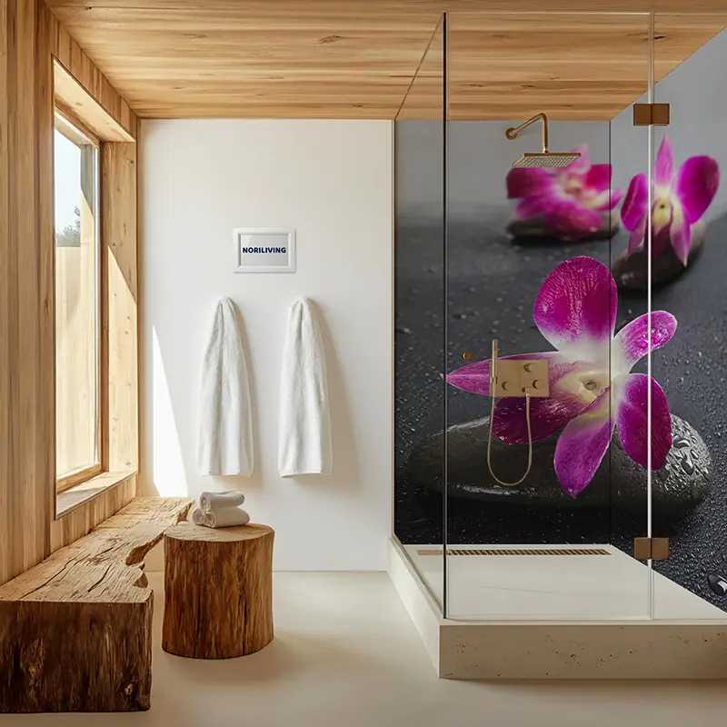 Duschrückwand Einzel | Ecke | Alu Zen Steine mit Orchideen 642