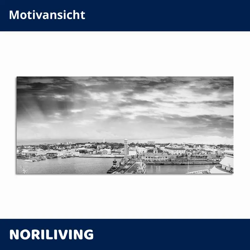 Produktinformationen "Fliesenspiegel Alu Bunte Küstenstadt und Kreuzfahrtschiff im Hafen 038 schwarz-weiß"