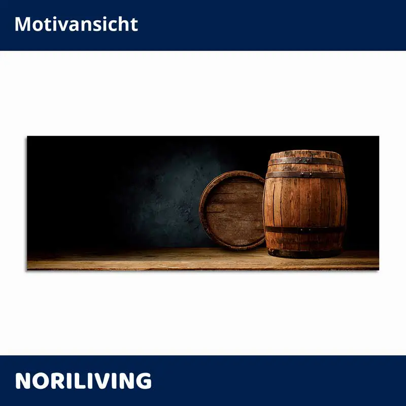 Produktinformationen "Fliesenspiegel Alu Rustikales Holzfass auf Holztisch, Dekoration 624"