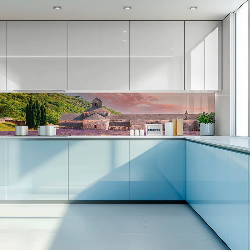 Produktinformationen "Küchenrückwand Alu Schöne Landschaft Lavendelfeld und ein altes Kloster Frankreich 071"