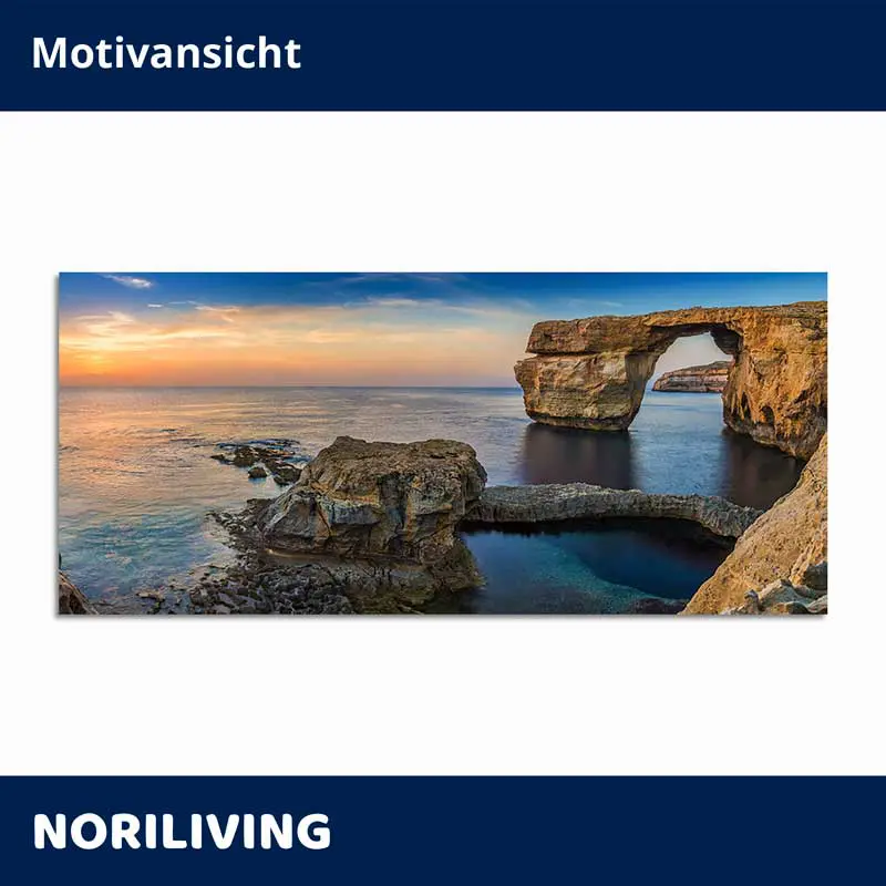 Produktinformationen "Küchenrückwand Echtglasoptik Profiline Felsbogen am Meer bei Sonnenuntergang 521"