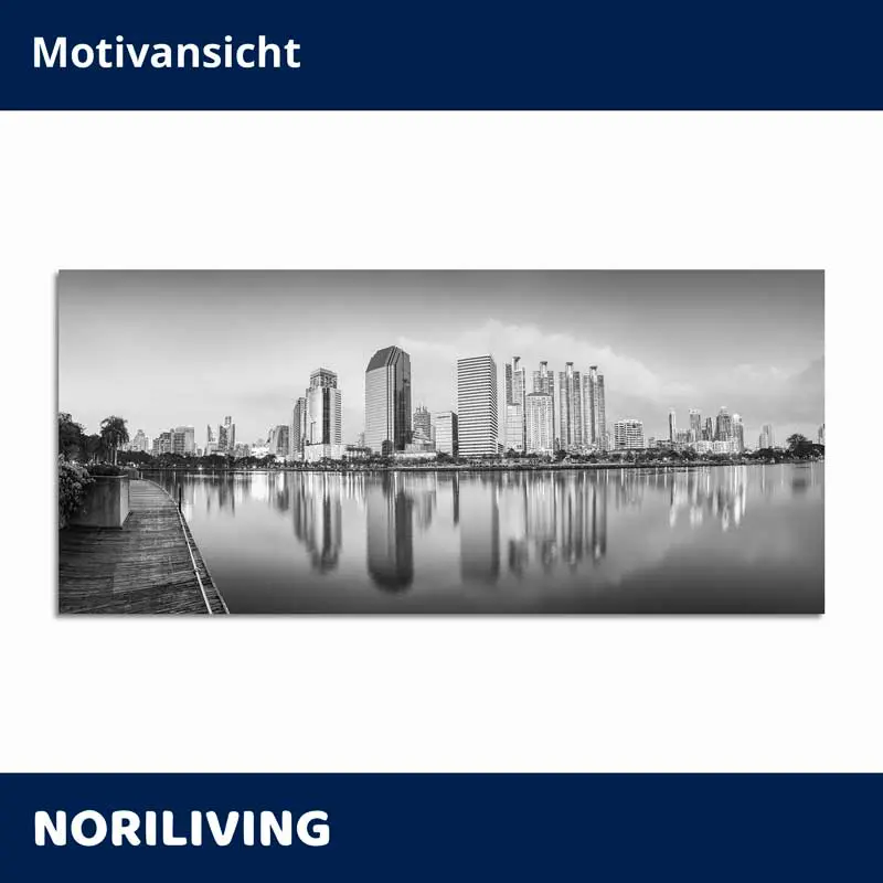 Produktinformationen "Küchenrückwand Glas Spiegelung der Wolkenkratzer im Benchakitti-Park Bangkok Thailand 064 schwarz-weiß"