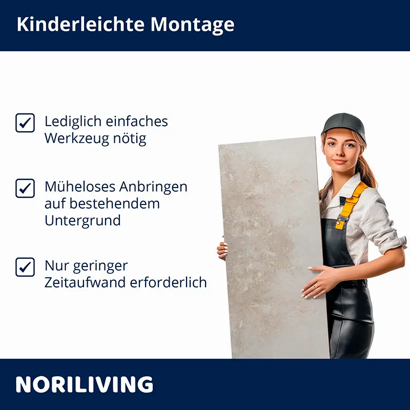 - Weniger Staub, Lärm, Schmutz und Abfall im Vergleich zur herkömmlichen Fliesenverlegung