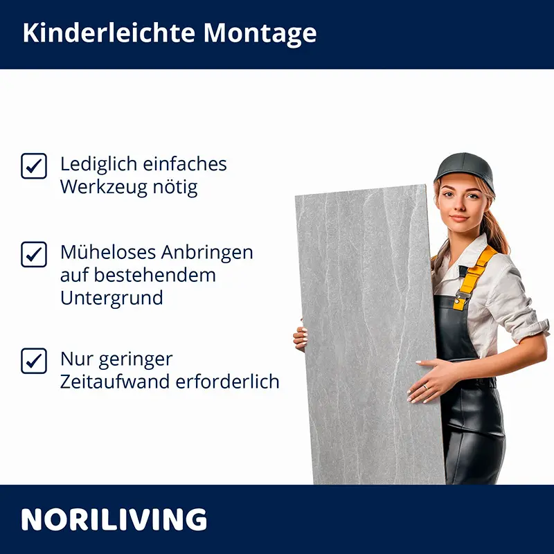 - Weniger Staub, Lärm, Schmutz und Abfall im Vergleich zur herkömmlichen Fliesenverlegung