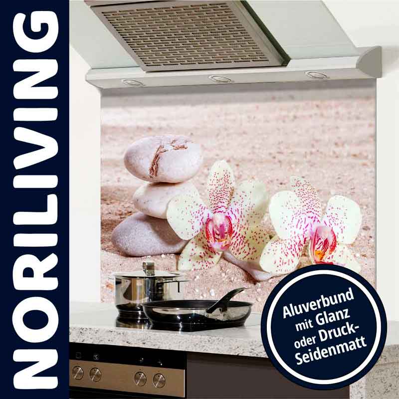 Produktinformationen "Spritzschutz Küche - Herd Alu Orchidee mit Zensteinen im Sand 609"
